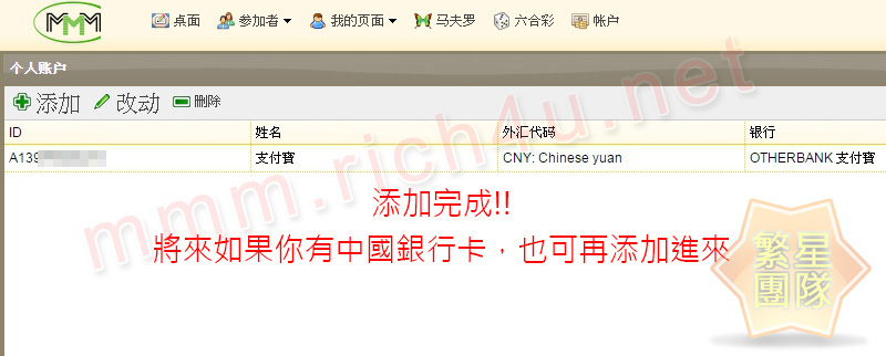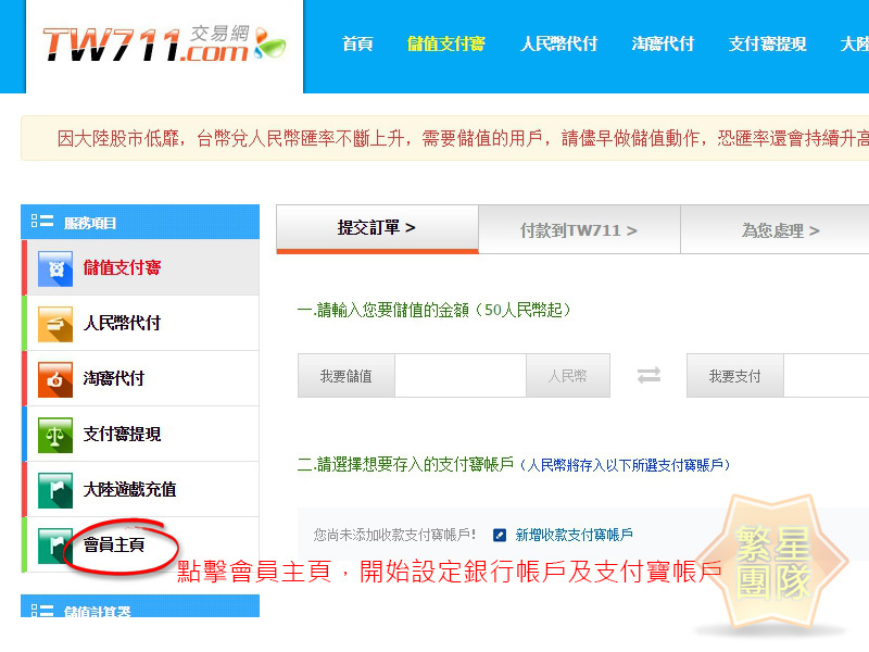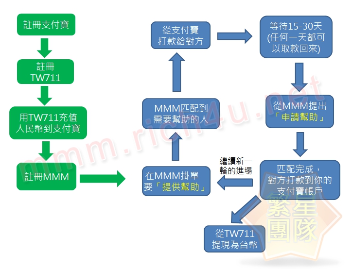 MMM加入流程 2015-09-06 10:04 要怎麼每天賺1%的收益呢? 請照以下流程走,不要跳著進行,確實做好每一步驟就對了!! 加入流程示意圖 註冊MMM前準備 ①支付寶申請教學 為什麼要用支付寶,因為目前台灣是整合在中國系統內,而我們提供幫助(打款)給對方,或是申請幫助(收款),支付寶是最方便快速與中國金流對接的方法。 ②TW 711支付寶代充值教學 非台灣朋友不用申請,有中國銀行卡不用申請 支付寶如果沒有實名認證,無法直接存錢及提現,所以還需要一間金流配合,TW711就是提供能幫忙從支付寶存錢及提現的線上金流服務網站。 1.免費註冊MMM
