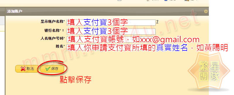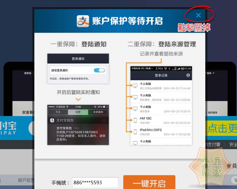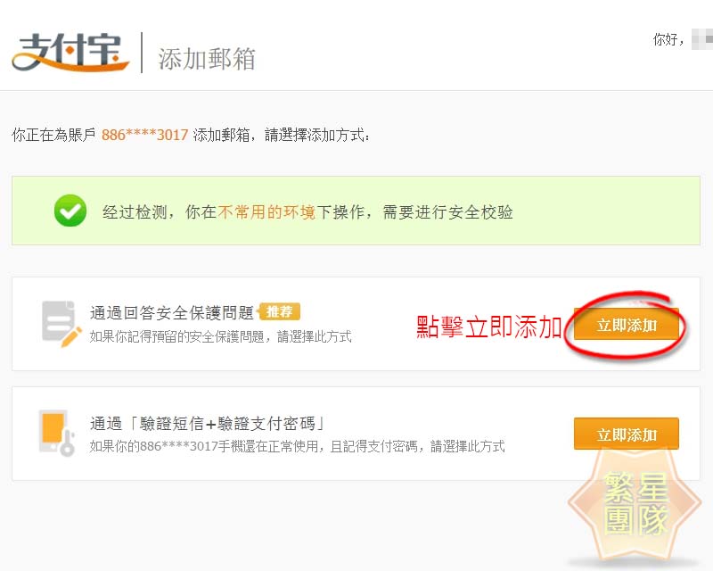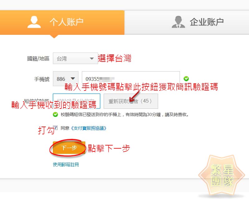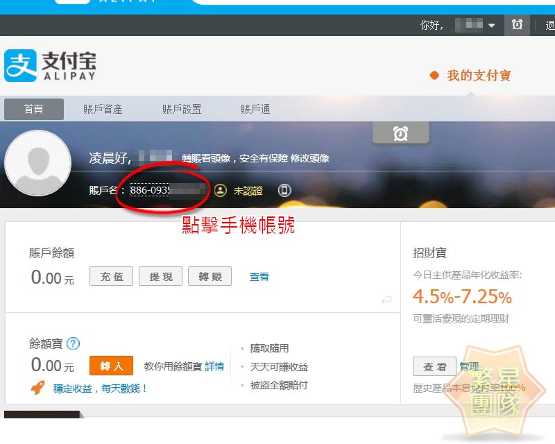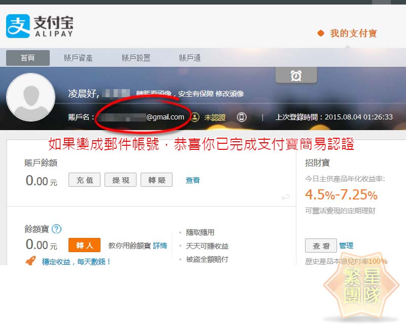 支付寶申請教學(簡易認證) 2015-09-06 10:12 支付寶申請教學(簡易認證) 申請完簡易認證才可以開始使用支付寶轉帳 1.點擊進入支付寶網站 https://auth.alipay.com 2.填寫手機號碼獲取驗證碼 3.填寫資料 4.登錄支付寶後台 5.日後想增加再自行增加 6.開始進行簡易認證 7. 8. 9. 10. 11. 12. 13. 14.重新登入後,就會變成是郵件帳號了。